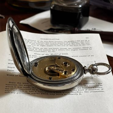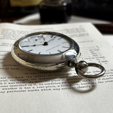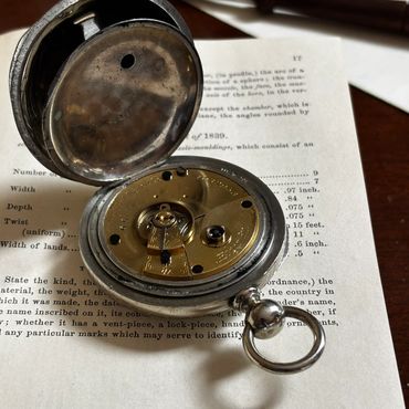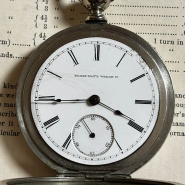 A common 18-size Elgin Model 1, low serial number 1032958 produced in 1883. Usually these were 7-jewel movements but this one currently has six jewels (more on this below). This watch is far from perfect but it is rugged and reliable in spite of its warts; it will not win a beauty contest, but it would make a great reenacting watch!
