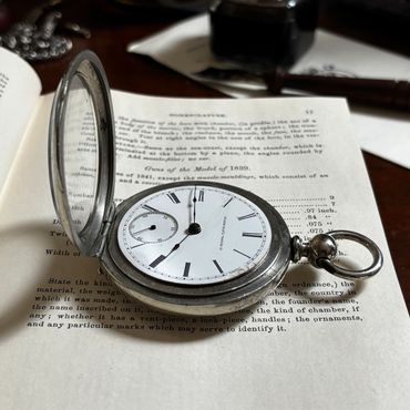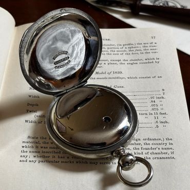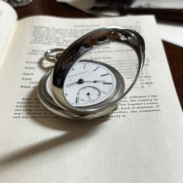 The Dueber Silverine (nickel alloy) case is a thinner version than the regular 18-size watch cases, which are enormous and bulky. It's in really good condition and the hinges are strong, with the case back and bezel opening slightly beyond the 90 degrees. They snap shut securely.