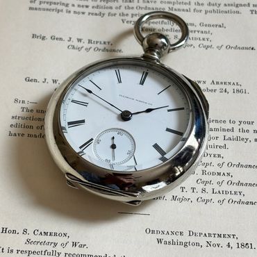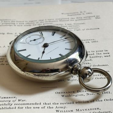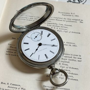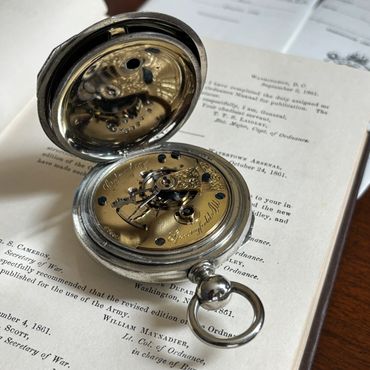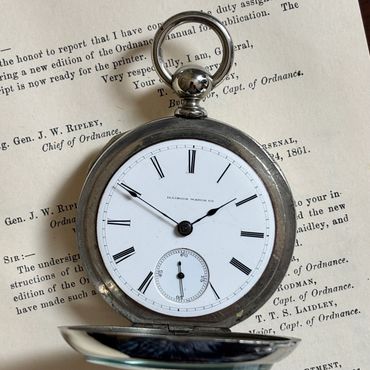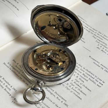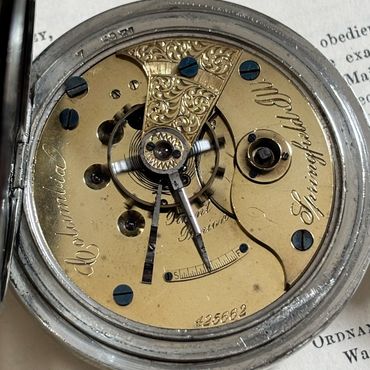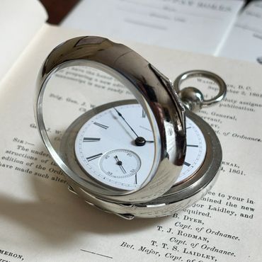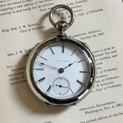 This is a sharp Illinois 18-size early key wind and key set pocket watch, in a solid case, running fantastically and keeping time within a minute a day. The serial number 425662 dates production to October 1882.