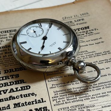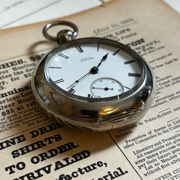 This key wind and key set Waltham Model 1877 is a grade “Wm. Ellery” (named for one of the signers of the Declaration of Independence), 18 size with 11 jewels, with the serial number 2023855 dating production to April 1883.