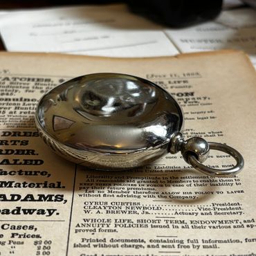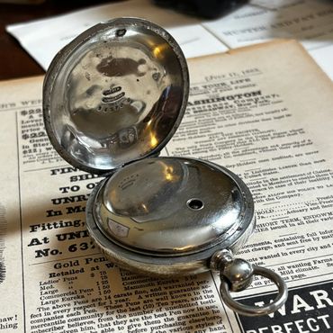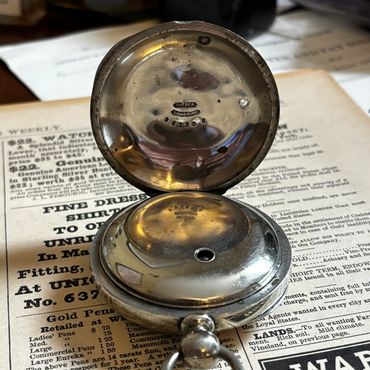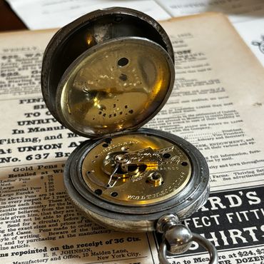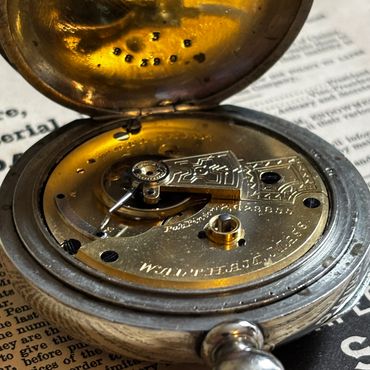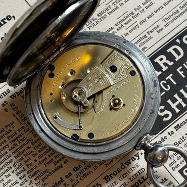 This particular watch is running extremely well after a thorough cleaning, and keeping good time within a couple minutes per day. All eleven jewels are intact. Both pivots of the escape wheel and fourth wheel are jeweled top and bottom, unlike some 11 jewel movements that have a jeweled bearing for the top plate only and merely to give the appearance of a higher quality movement. The movement has a blue spring steel mainspring that provides sufficient power and gives exceptional balance amplitude (about 290 degrees) for a Victorian vintage watch.