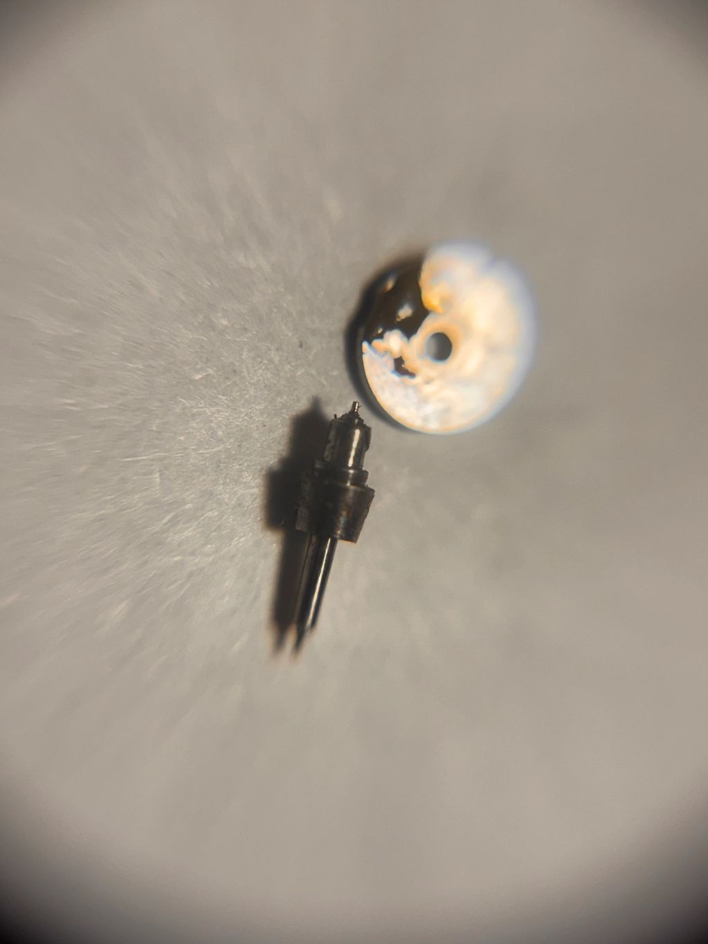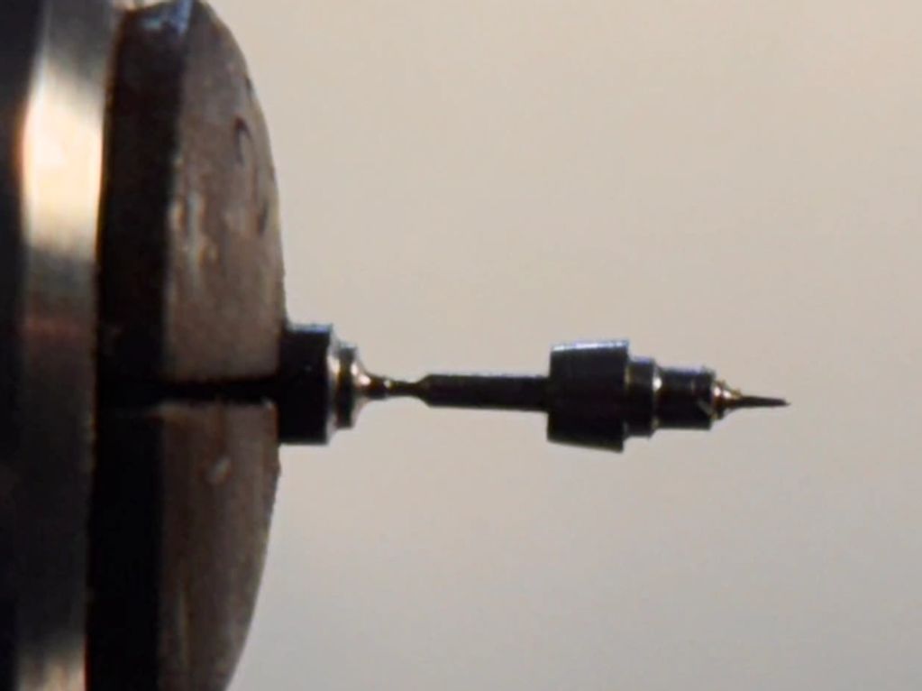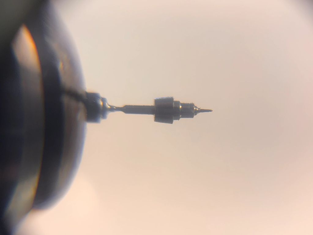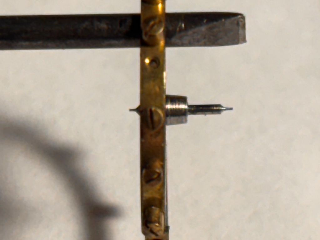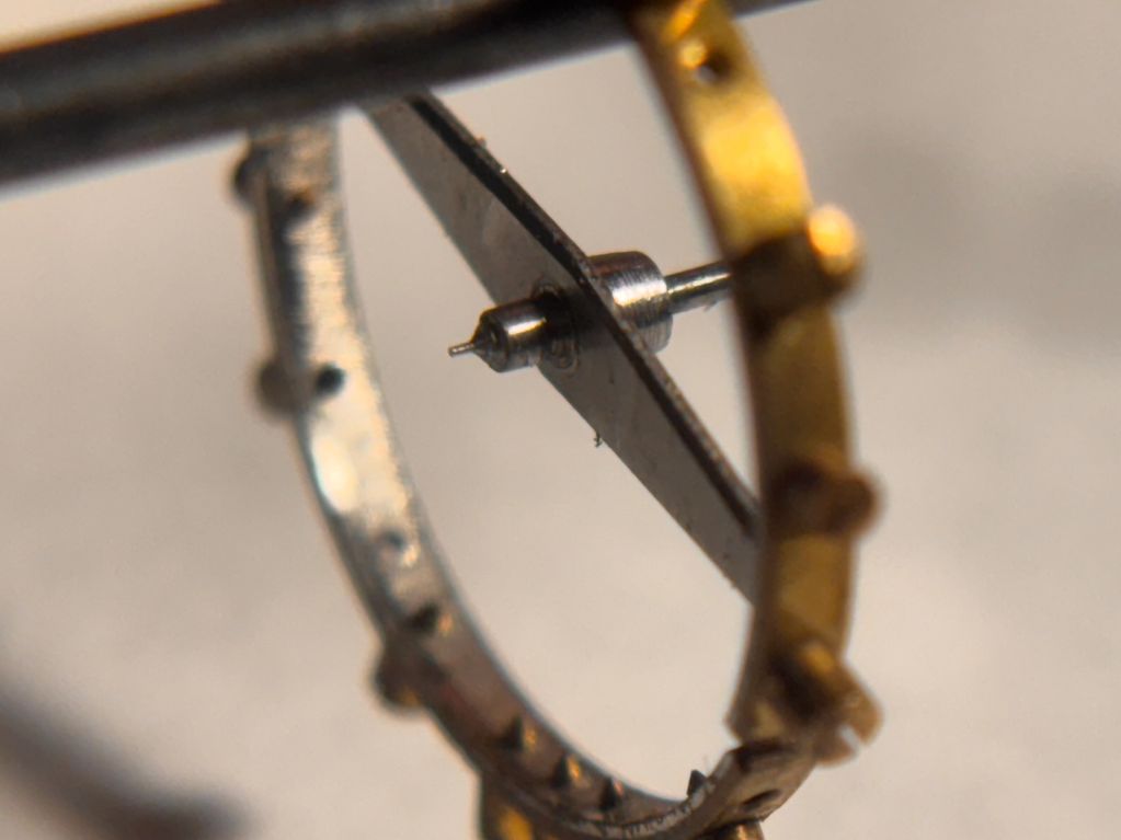 Fitting the staff to the balance wheel after shaping the pivots properly (and looking much better). If you look closely you can see the cut made in the staff that will form a rivet when staked onto the balance wheel.