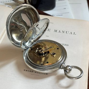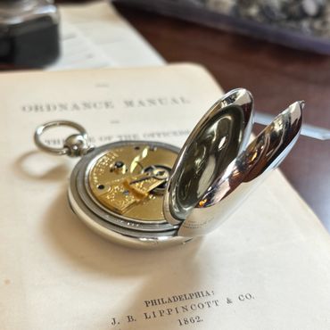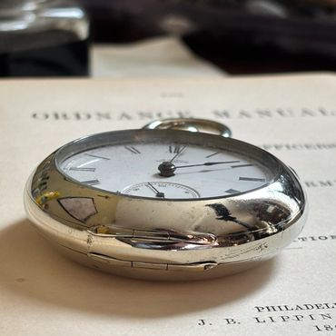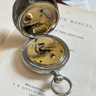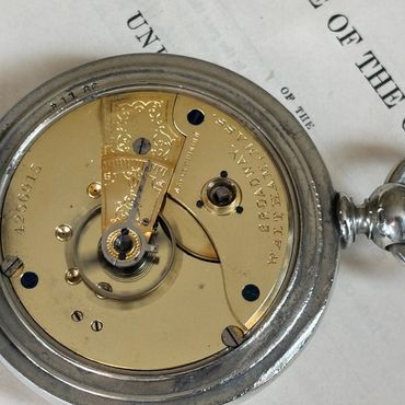 An unpretentious workhorse for the common man; this is a very late production Model 1877 in key-wind and key-set configuration, and the serial number 4256915 dates it to 1890. By that time, key-wind watches were old-fashioned but they were cheaper than stem-wind models due to simpler mechanisms, and they remained in production (especially for export to the European markets).